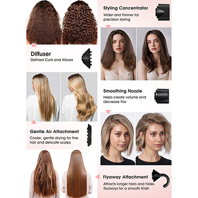 Accessories: Color box, user manul, 5 Attachments with Diffuser nozzle +Anti-flying nozzle + Softening nozzle + Smoothing nozzle + Sculpting nozzle