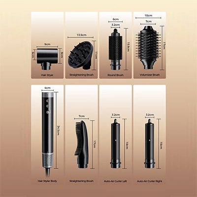 Color box+User manul+Hair Styler Body*1,Auto-Air Curler Left*1, Auto-Air Curler Right*1, Round Brush*1, Volumizer Brush*1, Hair Dryer*1, Straightening Brush*1, Diffuser*1, Gloves*1, Storage Bag*1